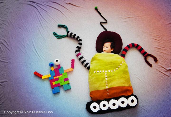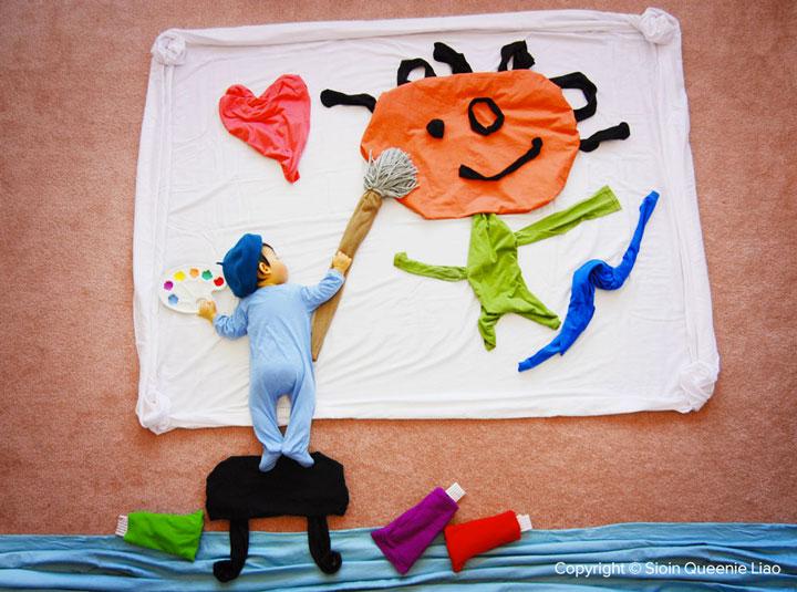 Pour rendre possible ces photos, Queenie explique : "je ‘peins’ derrière lui l’univers dans lequel il évoluera avec des vêtements, des peluches et d’autres objets de la maison".