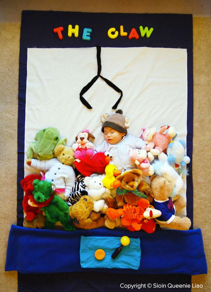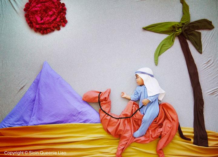 Pour rendre possible ces photos, Queenie explique : "je ‘peins’ derrière lui l’univers dans lequel il évoluera avec des vêtements, des peluches et d’autres objets de la maison".